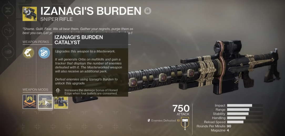 Destiny 2 How To Get The Izanagi S Burden Catalyst from www.vgr.com A powerful kinetic sniper that has the ability to pack the damage of 4 r. Getting the mysterious box for destiny 2 izanagi's burden quest Just all crammed in ther. Feb 10, 2021 · fastest way to complete catalyst for izanagi's burden and how to obtain destiny 2 season 13.how to get izanagis burden catalyst destiny 2. 0:00 gather watcher lens' from the underbelly in the levia. Jan 11, 2019 · we can finally make some progress on that mysterious box from black armory launch. Jan 15, 2019 · destiny 2 how to unlock izanagi's burden guide. Jan 12, 2019 · follow this complete guide to unlock the exotic sniper rifle izanagi's burden in destiny 2.step 1: